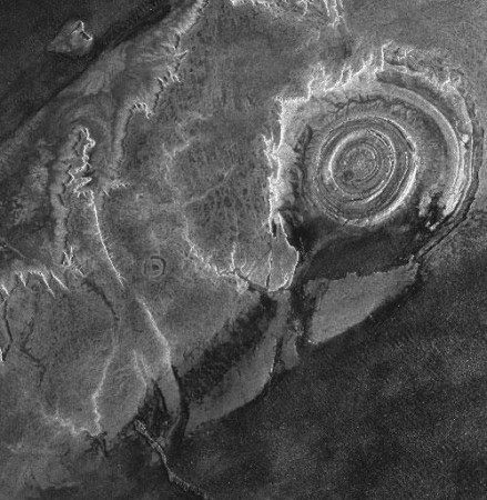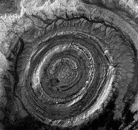 Кольцевая структура Гуэль-Эр-Ришат, видимая на снимке, расположенная в пустыне Сахара на территории Мавритании имеет диаметр около 45 километров. Она известна с первых космических полётов, тем, что привлекала внимание космонавтов, для которых была четким и легко узнаваемым земным ориентиром во время нахождения на орбите. Она образовалась в период между поздним протерозоем и ордовиком (самому древнему кольцу – 0,5-0,6 миллиардов лет). Возвысившийся первоначально в центре массив из известняка, доломитов и брекчий в последствии провалился. Метеоритная гипотеза происхождения кратера до сих пор еще подвергается сомнению. почти идеально круглая форма этого образования до сих пор заставляет спорить учёных что это – кратер от удара метеорита, жерло потухшего вулкана или… место высадки инопланетян… Один из последних снимков кольцевой структуры Гуэль-Эр-Ришат сделан 8 июля 2007 года… Это, так называемый, радарный снимок, распространенный германской компанией Infoterra GmbH, которая принимает и обрабатывает снимки, сделанные со спутника TerraSAR-X сразу после его запуска 15 июня 2007 года… Образование это относят к периоду между поздним протерозоем и ордовиком - самому древнему кольцу насчитывается 500-600 миллионов лет… Образование структуры Ришат в результате вулканического извержения также представляется крайне маловероятным из–за отсутствия купола из изверженных или вулканических пород… Раньше считалось, что она возникла после удара о Землю огромного метеорита, но дно структуры – не плоское, и следов от удара по краям самой структуры так и не выявлено. Поэтому сегодня большая часть исследователей полагает, что структура – результат эрозии, но объяснить ее почти идеально круглую форму даже и не пытаются – это загадка. Все версии по поводу возникновения Гуэль–Эр–Ришат, впрочем, до сих пор остаются гипотезами… Также как и загадочная круглая форма структуры…