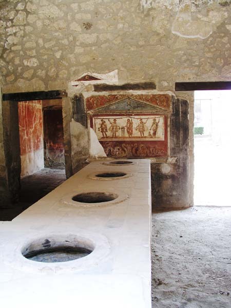 Фаст-фуд берет свое начало еще с Древнего Рима. Он назывался латинским словом «термополия». Еще древние римляне ввели в обиход такой вид услуг, как недорогая быстрая еда. В каждом римском городе существовала масса закусочных базаров, где торговали всевозможными кушаньями. Практически современные фуд-корты! Фото древнего «фаст-фудного заведения» Многочисленные местные фуд-корты, если можно так выразиться, предлагали своим посетителям недорогую еду, которая может быть пришлась бы по вкусу и современным поклонникам фаст-фуд (горячий хлеб, мясо, горошек и даже выпечка). У римлян существовала даже некая разновидность гамбургера — лепешка из говядины, смешанной с ядрышками орехов, которую ели с хлебом. Также большой популярностью пользовались лепешки из дрожжевого теста, смазанные оливковым маслом, их было очень удобно использовать как съедобные тарелки. Много столетий спустя эти лепешки, покрытые запеченным сыром, колбасами и овощами стали называться итальянской пиццей. Особенно интересный и наглядный древнеримский фаст-фуд имеется в Помпеях. Экскурсоводы там показывают развалины, которые когда-то были фаст-фудами и выходили витринами или чем-то похожими на них на улицу. В прилавки помещений вмонтированы большие чаны, в которых и готовилась еда. Вместо витрин в «древних фаст-фудах» были дощатые раздвижные перегородки, наглухо закрывавшиеся на ночь, но они использовались только по ночам, а днем никаких дверей вообще не было. Названий древних фаст-фудов история не сохранила. Возможно, они носили названия типа Стардог’s :) Но и это еще не все. Оказывается, римляне ввели в обиход еще такой вид услуг, как доставку еды на дом. Такой вывод был сделан в ходе многочисленных археологических раскопок, доказавших, что во многих римских домах вообще не было найдено кухонь. Видимо, поскольку большинство домов были деревянными, попытка приготовить еду на открытом огне и даже в очаге могла обернуться пожаром.